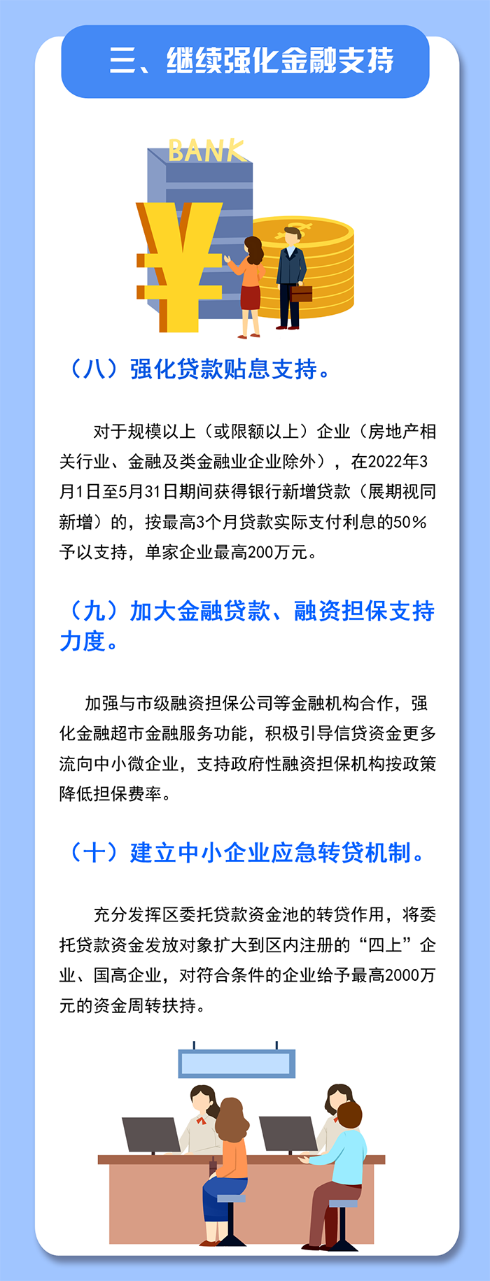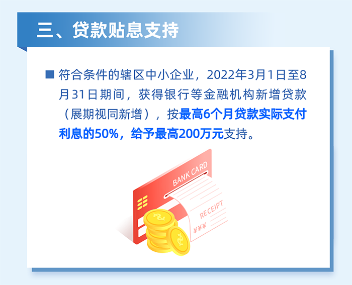 8.金融助力中小微企業(yè)發(fā)展,降低企業(yè)融資成本,對南山區(qū)中小微企業(yè)在2022年2月16日至4月30日期間(以發(fā)放貸款時間為準),獲得銀行等金融機構貸款(含展期)的,按實際支付利息最高50%給予貼息支持,貼息期限不超過3個月,每家企業(yè)不超過50萬元。(責任單位:區(qū)金融發(fā)展服務中心)