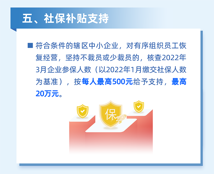 5.對南山區(qū)企業(yè)在深圳居住的員工,居住地自2022年2月1日至3月31日期間,因疫情防控被劃定為封控區(qū)、管控區(qū)(含參照管控區(qū)管理區(qū))而影響正常工作的,根據(jù)企業(yè)實際受影響的員工人數(shù)給予企業(yè)一次性社保補貼。按企業(yè)為受影響員工上月實際繳納社會保險費的30%且每人不超過600元,給予每家企業(yè)最高不超過10萬元的社保補貼。(責任單位:區(qū)人力資源局)