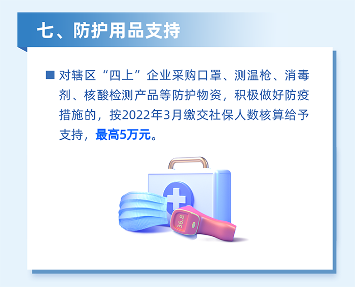 減輕企業(yè)防疫負擔。對為員工采購口罩、測溫槍、消毒劑、核酸檢測產(chǎn)品等防疫用品,以及應用檢測試劑、防疫醫(yī)療設備、智能測溫、數(shù)字化信息采集、無人車等數(shù)字防疫設備的區(qū)四類百強企業(yè),按2022年3月實際繳納失業(yè)保險人數(shù)給予100元/人的補貼,單家企業(yè)最高20萬元。(牽頭單位:區(qū)工業(yè)和信息化局、科技創(chuàng)新局)