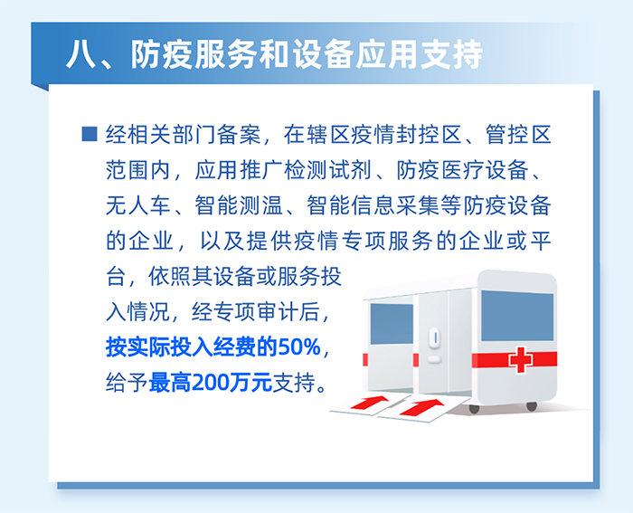 14.支持轄區(qū)科技企業(yè)圍繞疫情產(chǎn)生的新需求自主立項、先行投入,研發(fā)測溫、消殺、運輸、疫情動態(tài)監(jiān)測等人工智能科技抗疫產(chǎn)品,對在2022年2月1日至4月30日期間,將企業(yè)自主研發(fā)的人工智能科技產(chǎn)品無償應用于南山區(qū)公共場所進行公益性疫情防控工作的,按照不超過其上一年度抗疫相關產(chǎn)品研發(fā)投入總額的20%且不超過無償應用產(chǎn)品的總價值給予資助,每家企業(yè)資助最高不超過20萬元。(責任單位:區(qū)科技創(chuàng)新局)