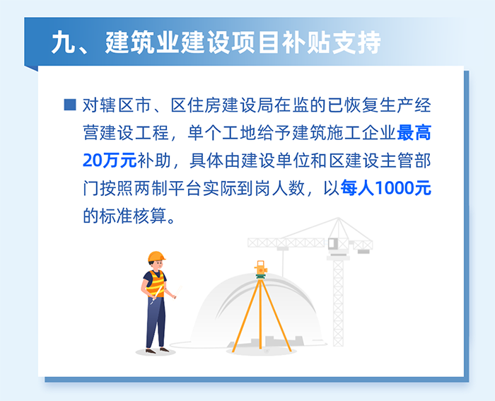 發(fā)放在建項目臨時停工補貼。對轄區(qū)范圍內(nèi)區(qū)住建、區(qū)水務、區(qū)城管、區(qū)交通以及街道在監(jiān)的已開工建設工程,在政府依法采取停工等緊急措施期間,按市區(qū)政府部門停工通知前一天錄入“兩制”平臺的勞務工人數(shù)給予900元/人的補貼給企業(yè),相關補貼由企業(yè)通過“兩制”平臺發(fā)放至勞務工人賬戶。(牽頭單位:區(qū)住房和建設局)