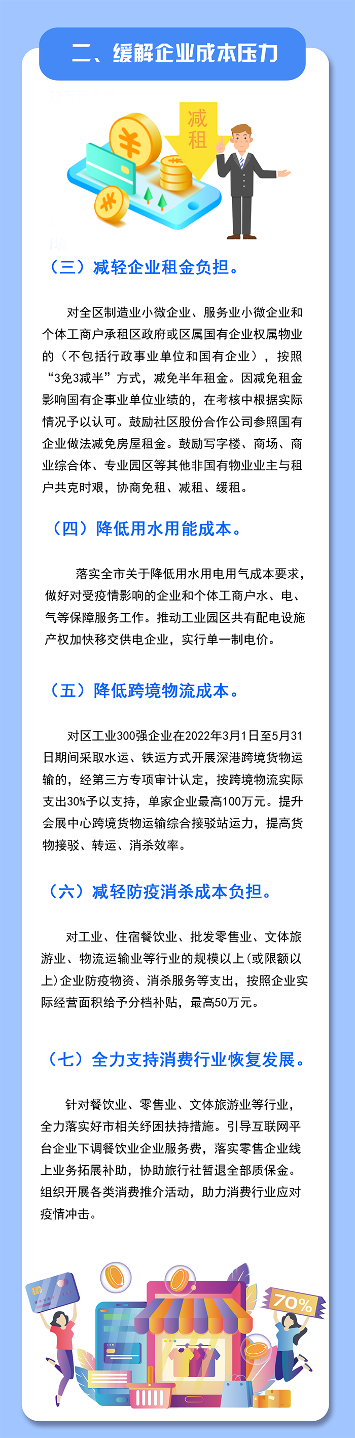 4.鼓勵寫字樓、商場、商業(yè)綜合體、專業(yè)園區(qū)等各類業(yè)主與租戶共克時艱,協(xié)商免租、減租、緩租。對南山區(qū)商業(yè)綜合體、購物中心、大型綜合性商業(yè)零售企業(yè)的經(jīng)營管理主體符合條件的承租企業(yè)減免租金天數(shù)在半個月(含)以上的,按照2022年2月1日至3月31日期間減免租金總額的30%給予經(jīng)營管理主體最高200萬元的資金支持。(責任單位:區(qū)工業(yè)和信息化局)