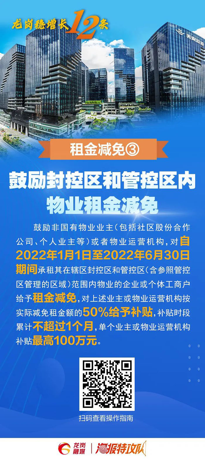 鼓勵倡導其他市場主體參照減免物業(yè)租金。對2022年3月1日至5月31日期間實際減免租金60萬元以上的社區(qū)股份合作公司(按歸屬社區(qū)股份合作公司的租金計算),及經(jīng)營管理工業(yè)園區(qū)、寫字樓、商場等物業(yè)的企業(yè),按其減免實際租戶租金的20%予以支持,單家企業(yè)最高200萬元。(牽頭單位:區(qū)投資推廣和企業(yè)服務中心)